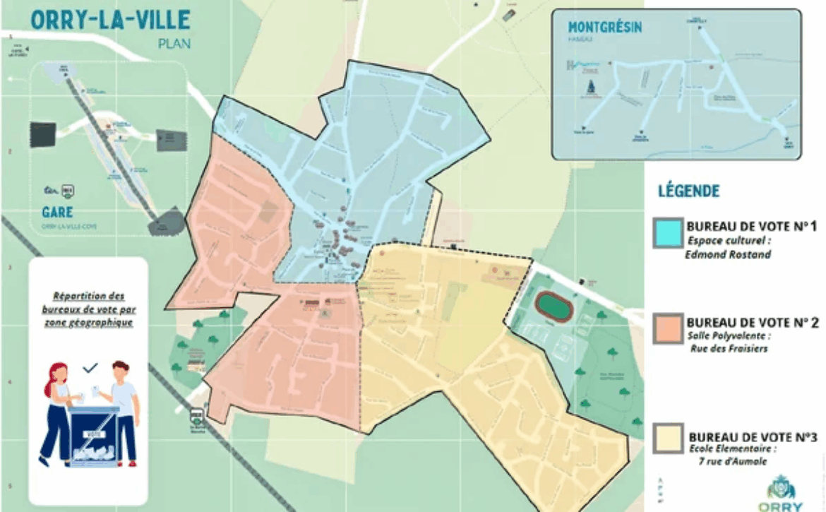 Il y a trois bureaux de vote à Orry-la-Ville : espace culturel, gymnase et école élémentaire. Retrouvez la répartition par bureau de vote sur le plan ci-dessous.
